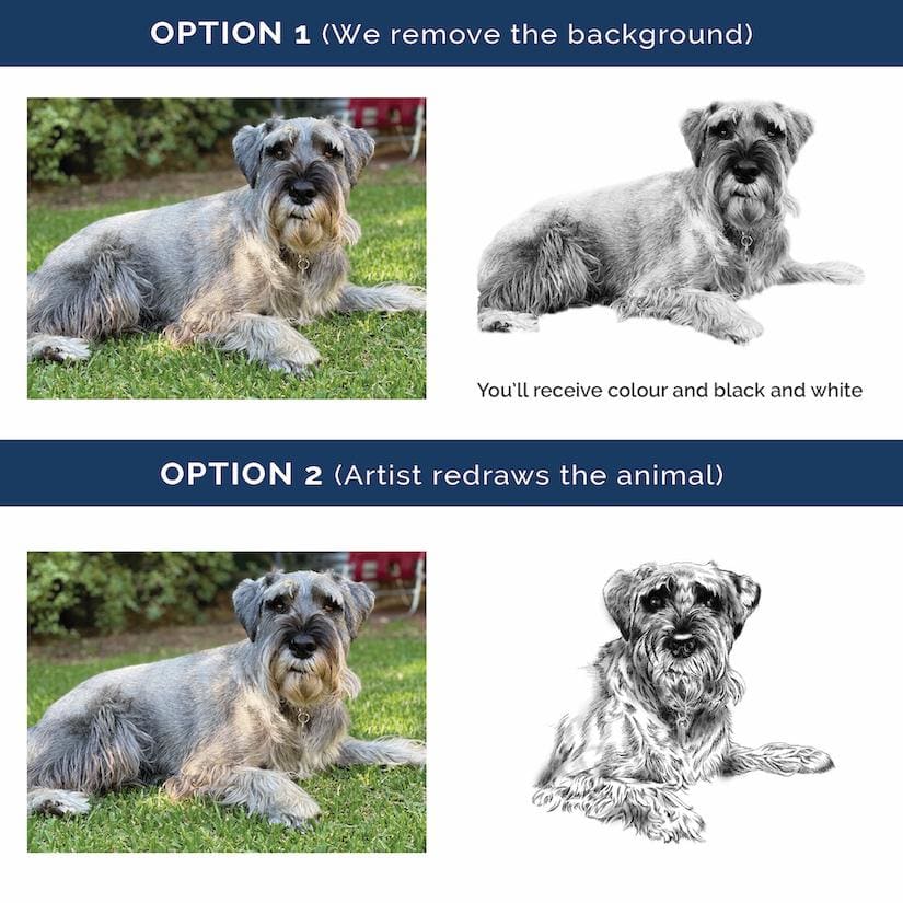 One of our artists will redraw your pet in your chosen style (e.g. simple back line). This is obviously more expensive as the artist spends time drawing your pet. You will receive the original artwork, which you can use for any purpose e.g. have it printed and framed.