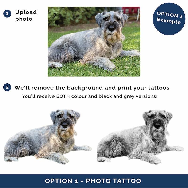 We turn your pet photo into a temporary tattoo by carefully removing the background. This is the cheapest option because it doesn't involve an artist re-drawing your loved one.