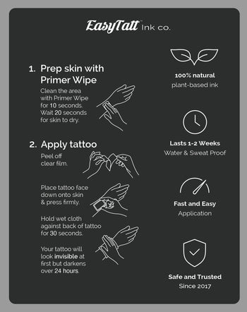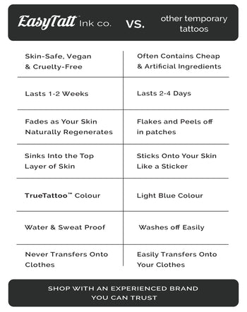 Unlike cheap knock-offs that have a 3-month shelf life, EasyTatt non-permanent tattoos last 12 months before losing any potency!